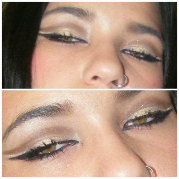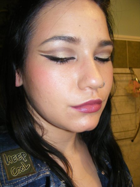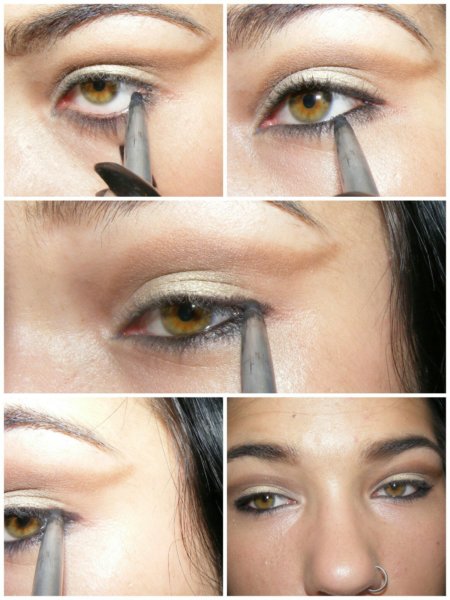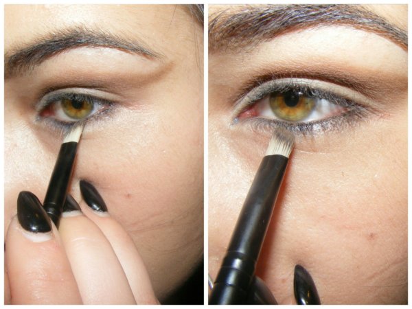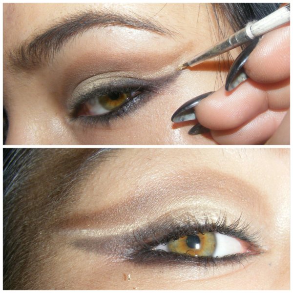 Ezt az követte, hogy húztam a barna farincával párhuzamos vonalat, majd elsatíroztam az egész szemceruzás mázolmányt a ferde ecsetemmel, majd a két farkincám közé visszatértem a krémgél állagú szemhéjfestékkel egy pincuri ecsettel. 🙂 Ügyelj arra, hogy az alsó vonalad ne legyen hosszabb a felsőnél!